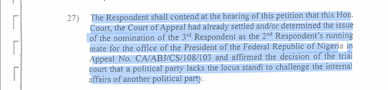 Just three paragraphs later in paragraph 27, it concedes that the PDP did, in fact, challenge Shettima’s nomination.