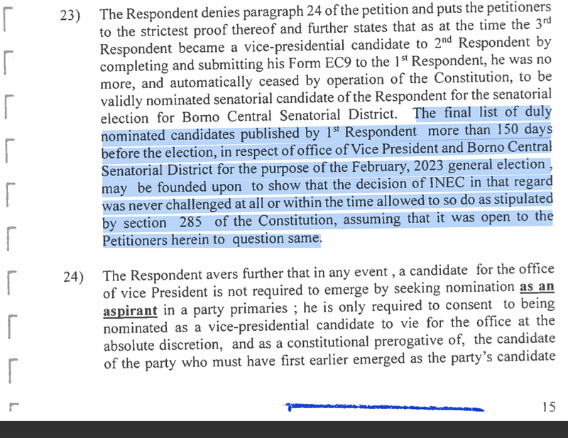 For example, page 15, paragraph 23 claims that “the decision of INEC [in publishing a list of candidate names including Shettima] was never challenged at all or within the time allowed to do so, as stipulated by section 285 of the Constitution.”